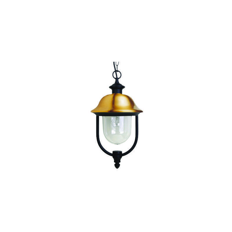 In alluminio pressofuso, copertura finitura ramata schermo termoplastico trasparente. attacco e27 - ip44. dimensioni ø25xh47 cm. + catena 50 cm.
