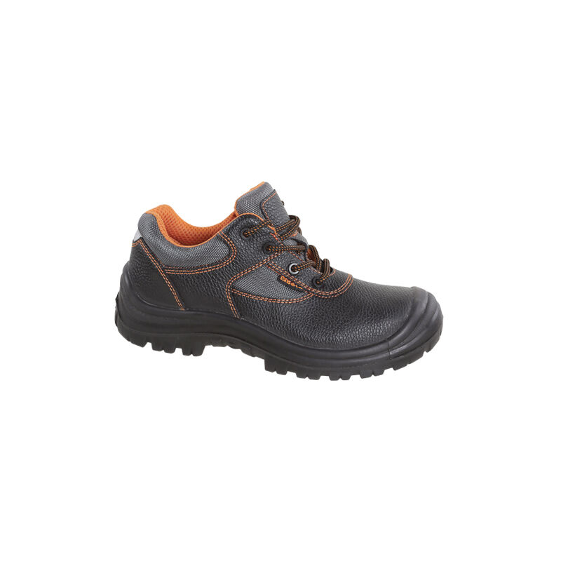 In pelle idrorepellente con inserti in nylon, copripuntale di rinforzo in poliuretano ed inserto rifrangente sul tallone, suola poliuretano bidensitã, puntale in acciaio resistenza 200 joule, antiperforazione fibra composita con trattamenti ceramici, sot