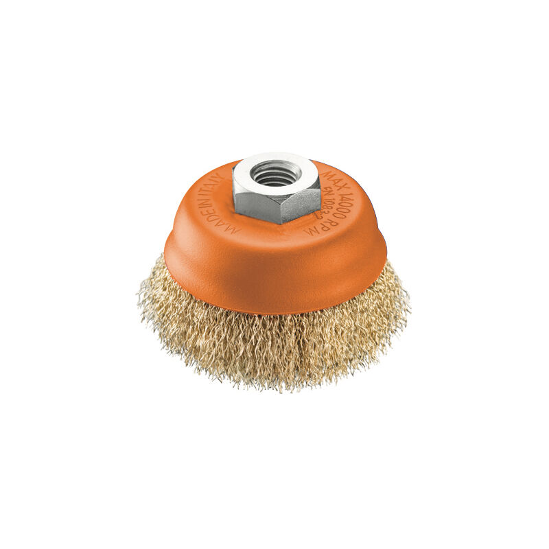 In acciaio ottonato ondulato. fili diametro 0.30 mm. - attacco m14. ideale per pulire, satinare, sbavare, rimuovere ruggine e scorie, sverniciare.
