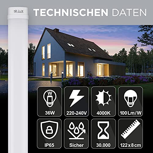 NF-LUX Lampada a LED per ambienti umidi, 122 cm, 36 W/3600 lm, 4000 K, tubo fluorescente a LED, IP65, impermeabile, per cantina, garage, officina, ufficio ed esterni [classe energetica F]