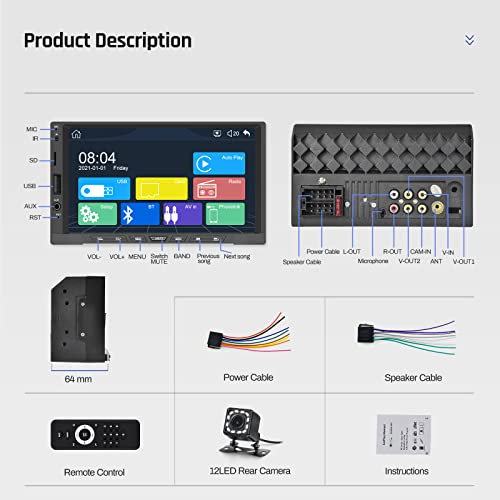 【Autoradio Bluetooth multifunzionale】 Super HD 1024 x 600 touch screen altoparlante bluetooth bluetooth integrato con vivavoce/rubrica. Connessione Hotspot / WiFi. Supporta il controllo del volante, l'uscita RCA (interfaccia di uscita microfono/subwoofer), la ricarica del telefono, il set di illuminazione dei pulsanti a 7 colori