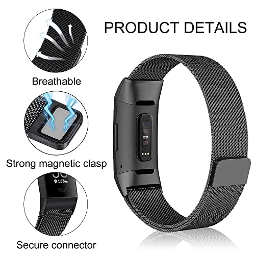 Niboow Cinturino per Fitbit Charge 3/Charge 4, Uomini Donne Acciaio Inossidabile Metallo Chiusura Magnetico Cinturino, Sport Traspirante Leggero Regolabile Cinturino per Fitbit Charge 3/Charge 4-Nero