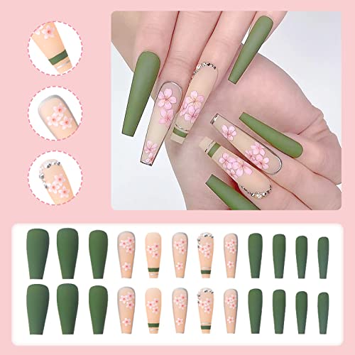 NICENEEDED 24Pcs Unghie Finte Verde Bara con Fiore, Ballerina di Diamante Stampa Sulle Unghie, Unghie Finte Extra Lunghe con Adesivi con Colla per Unghie