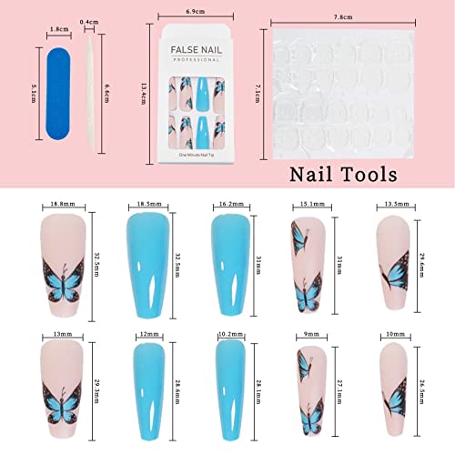 NICENEEDED Unghie Finte A Forma di Farfalla Azzurra, Ballerina Lucida Stampa Sulle Unghie, 24 pezzo di Unghie Finte Extra Lunghe con Adesivi per Colla per Unghie