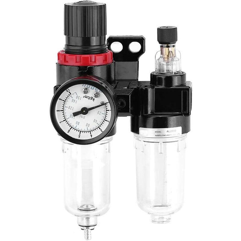 Alta qualità: adozione di lega di alluminio e plastica di alta qualità, prestazioni e longevità estremamente stabili. Fonte d'aria stabile: aiuta a pulire l'aria di origine, filtrare l'umidità dall'aria e fornire un ambiente relativamente stabile fonte d'aria. Funzione di lubrificazione - Può fornire olio lubrificante proporzionale alle apparecchiature pneumatiche per prolungare la durata dell'utensile pneumatico. Rilievo semiautomatico - Design di scarico della pressione differenziale da realizzare scarico semiautomatico. Campo di pressione dell'aria di controllo - Da 0,05 MPa a 0,85 MPa. Caratteristiche: Condizione: 100% nuovo di zecca Materiale: lega di alluminio + plastica pan> Colore principale: nero Tipo: AFC2000 Colore principale: nero Filettatura di connessione: G1/4 Medio: Air Temperatura ambiente: 5~60 Intervallo di pressione regolabile: 0,05~0,85 MPa Flusso massimo: 650L/min Resistenza alla pressione: 1.5Mpa (213psi) Precisione cartuccia filtro: 40μm Capacità bottiglia
