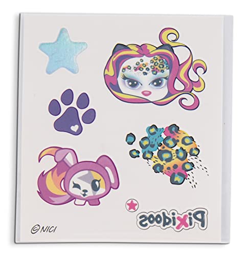 il set include adesivi per tatuaggi, un pettine paillettato e un braccialetto dell'amicizia Pixidoos;