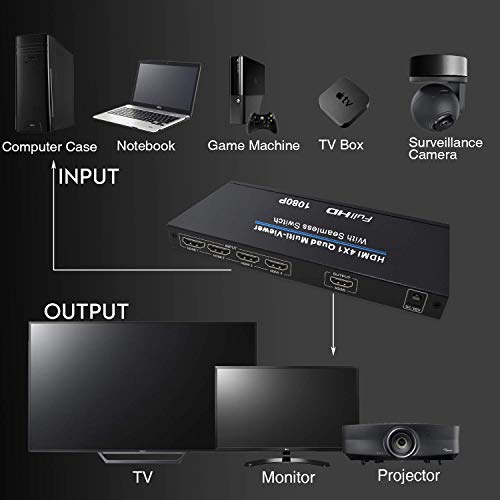 NIERBO HDMI Switch 4X1, HDMI Quad Multi-Viewer HDMI Splitter Controllo IR Continuo Supporto 3D UE 5 modalità per PS3 / PC/STB/Dvd (4k Non è supportato)