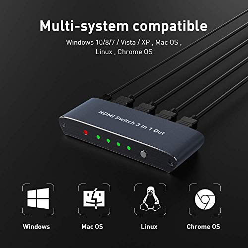 【INTERRUTTORE HDMI 3 x 1】 Interruttore HDMI Ver 2.0 3 ingressi 1 uscita compatibile con HDCP 2.2. Sono disponibili due modalità di commutazione, il pulsante di attivazione / disattivazione sul prodotto e il telecomando. Il guscio in lega di alluminio dissipa rapidamente il calore e fornisce una trasmissione ad alta velocità senza ritardi.
