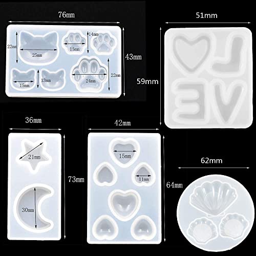 Contenuto della confezione: riceverai 5 stampi per gioielli tra cui 1 a forma di cuore, 1 a forma di cuoricino, 1 a forma di zampa di gatto, 1 a forma di luna e stella, 1 a forma di conchiglia.