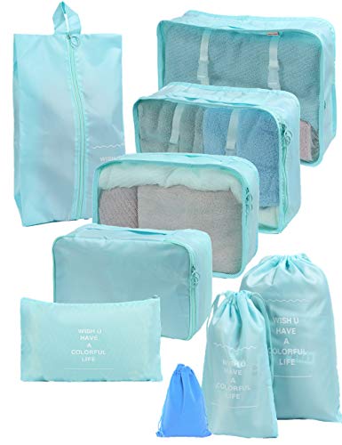 Nifogo Organizer da Viaggio, per Bagagli, per 8 Piccoli Oggetti, con Borsa per Scarpe, Vestiti asciutti, Scarpe, Cosmetici, Libri Blu Lake Blue(Lago Blu)
