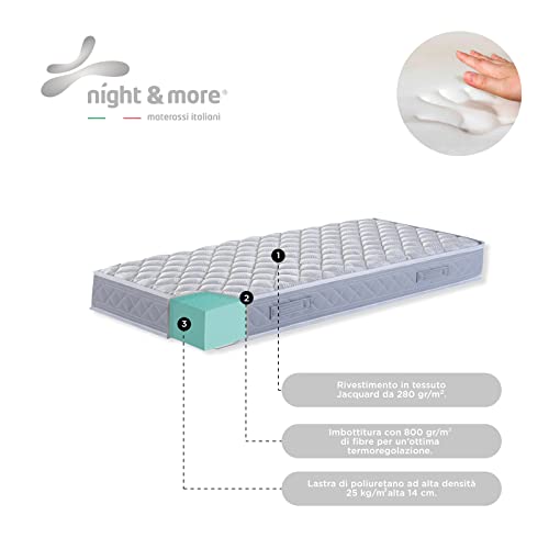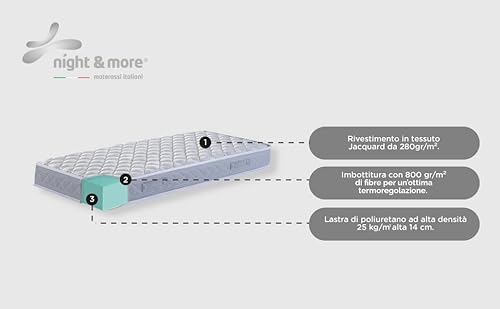 100% MADE IN ITALY: Il prodotto è rigorosamente Made in Italy, dalla progettazione, al design, alla produzione. Frutto dell'esperienza dell'azienda presente da più di 55 anni nel settore del bedding. Come Night&More vogliamo offrire un prodotto dinamico, che mantiene infatti qualità e italianità pur adeguandosi alle più disparate esigenze del riposo e del design.