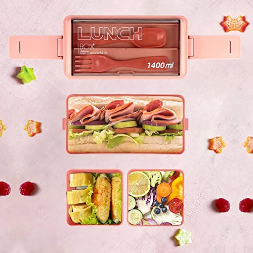 Ninevi lunch box,1400ml Kids Bento Box con 3 Scomparti,porta pranzo da ufficio,contenitori per frutta,Portapranzo senza BPA, Sicuri per Microonde e Lavastoviglie (Rosa)