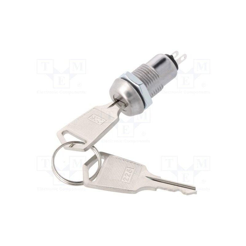 Interruttore a chiave (2 tasti) Modo di funzionamento OFF-ON Configurazione dei contatti SPST Numero di tutte le posizioni 2 Dimensioni del foro di montaggio Ø12mm Forma dei tasti piatti Tipo di chiave asimmetrica Materiale dell'alloggiamento in lega di zinco Capacità di carico del contatto 1A / 125V AC Angolo di rotazione meccanica 90°. Lunghezza totale 30,5 mm Coprimorsetto argentato Coperchio del contattore argento Numero di posizioni stabili 2 Misure vedi Chiave con codice casuale Tasto per rimuovere in qualsiasi posizione