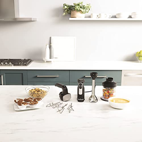 INCLUDE: Frullatore a immersione, sbattitore e tritatutto, base 850W (spina EU), accessori per frullatore e sbattitore, 2 ganci per sbattitore, 2 ganci per impastare, ciotola tritatutto 700ml con lame sovrapposte, ricettario. Colore: nero