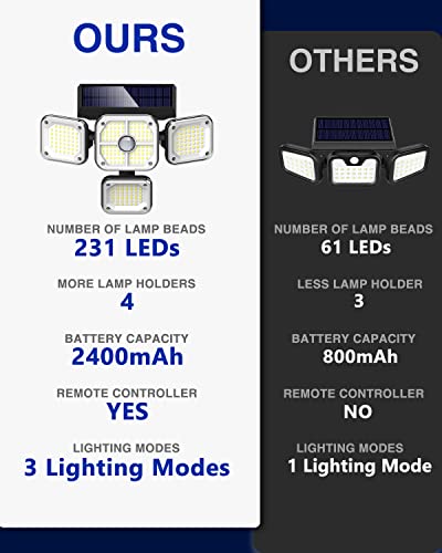 【Luce solare led esterno a 231 LED super luminosa a quattro teste】 Nel 2021, l'ultimo design di 4 teste della lampada rotanti flessibili, con un ampio angolo di illuminazione di 300 °, 231 perle della lampada a LED con temperatura di colore 6500K forniscono una luce super brillante, fornendo un'illuminazione più brillante rispetto ad altre luci solari, quattro teste della lampada possono essere ruotate, Fornire illuminazione a tutto tondo.