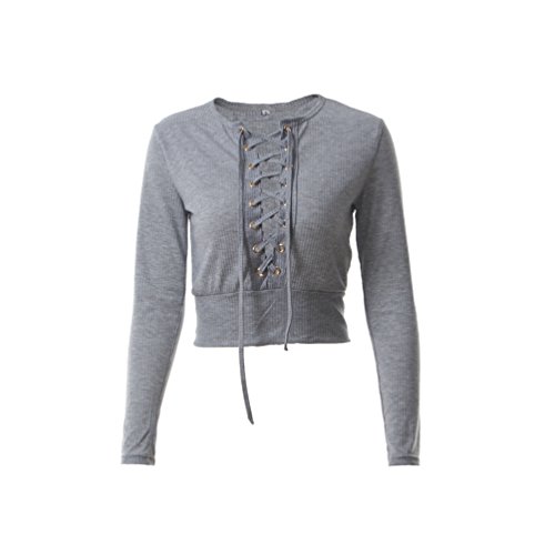 NiSeng Donna V-Neck Crop Top t shirt Manica Lunga da Croce Bandage Profondo V Sweatshirt Top Autunno Grigio M