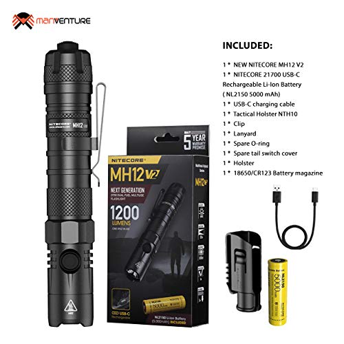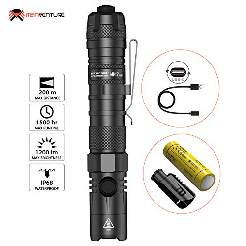 Nitecore MH12 V2 Lampada Tattica - 1200 Lumen Torcia Ricaricabile - IP68 Impermeabile ([21700 Batteria Ricaricabile E Cavo USB C Incluso]) Nero