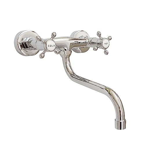 NIUKOMY Rubinetto Cucina a Muro, Miscelatore Tutti di Rame Cromo, Rubinetto Doppia Manopole Leva Caldo e Freddo per Lavello Girevole 360° con Bocca a S per Cucina Bagno Vasca Lavanderia, Argento