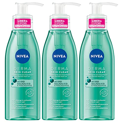 Nivea Derma Skin Clear Gel Detergente Viso Anti-Imperfezioni Formula Vegana con Acido Salicilico e Niacinamide per Rimuovere il Sebo in Eccesso Contro Impurità e Punti Neri - 3 Flaconi da 150ml