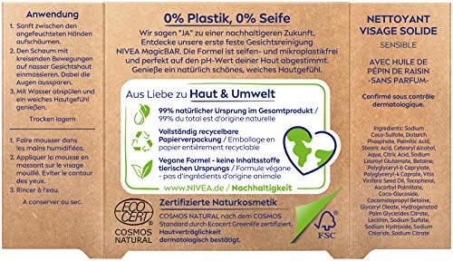 Contenuto della confezione e dettagli: Nivea MagicBar detergente per il viso Sensitiv, 75 g, con olio di semi d'uva, confezione di carta completamente riciclabile, codice articolo 94488