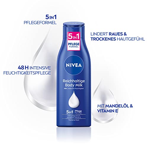 Contenuto della confezione e dettagli: NIVEA Body Milk con siero per la cura profonda, olio di mandorle naturali e vitamina E per pelle secca (250 ml), codice articolo 80201