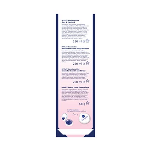 Pratico contenuto della confezione - Nivea Rosy Shine Set coccole con NIVEA Care Sensitive (200 ml), Labello Pearly Shine (4, 8 g), doccia (250 ml) e shampoo (250 ml), articolo numero 95207.
