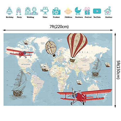 NIVIUS FOTO 2,1 x 1,5 m Fotografia Sfondo Mongolfiera Aeronave Vela Nave Compleanno Sfondo Mappa del Mondo Avventura Viaggi Vinile Sfondo Studio Fotocall Puntelli w-2077