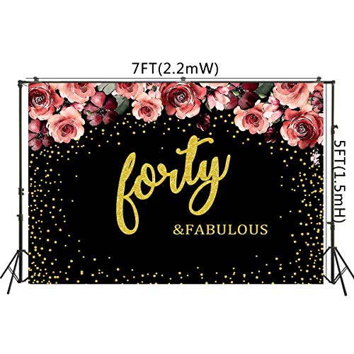NIVIUS PHOTO 2,1 x 1,5 m sfondo per 40° compleanno per le donne, festa di 40 anni, striscione per feste in nero e oro, motivo floreale, in poliestere, W-2298