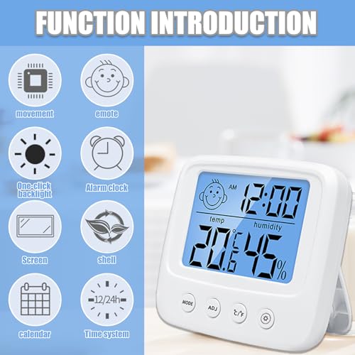 Nizirioo Termometro Digitale per Interno: Igrometro Con Retroilluminazione, Orologio e Funzione ℃ / ℉, 2 Pezzi LCD Digitale Thermometerc on Emoji per Cameretta dei Bambini, Ufficio (Bianco)