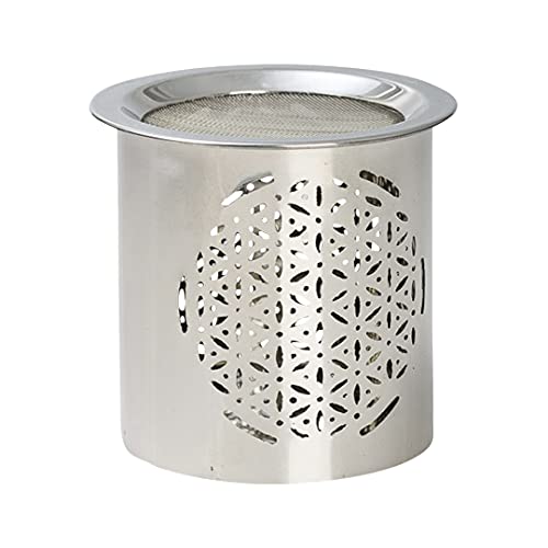 Il bruciatore di incenso è in acciaio e di colore argento. L'altezza del bruciaincenso è di 8 cm. Il suo diametro è di 8 cm. Il fiore della vita è inciso sulla superficie.
