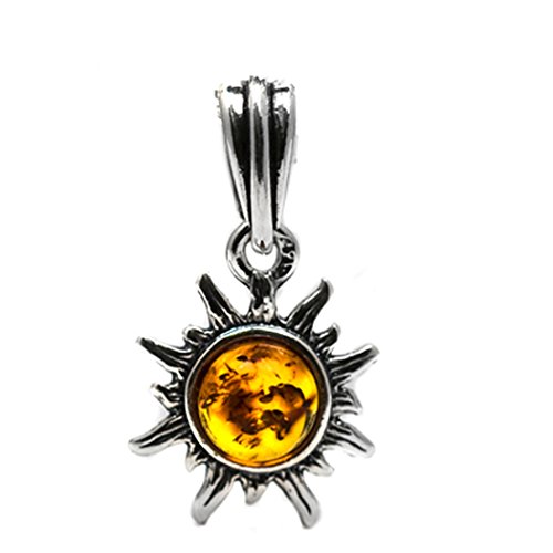 Noda - Ciondolo/pendente a forma di sole in ambra baltica color miele e argento sterling, misura molto piccola