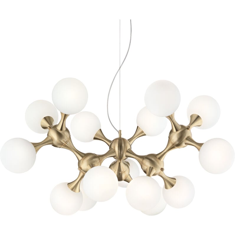 Collezione Nodi PER CHI AMA OSARE Lampadario con montatura asimmetrica in metallo ottone satinato h. 277 cm max e largh. 105 cm.. Dotato di 15 diffusori dalla forma a sfera in vetro bianco soffiato, acidato o trasparente ed attacco piccolo E14 max 40 W.