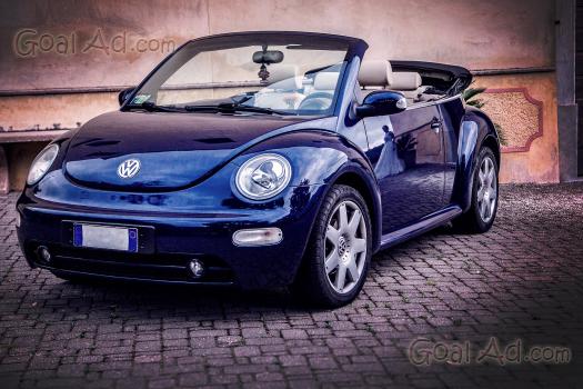 Noleggio per matrimoni e non solo VW New Beetle Cabriolet del 2004 color blu, interni in pelle beige, tenuto perfettamente, completamente originale. E' stato utilizzato in alcuni set cinematografici e spesso presente in fiere e manifestazioni automobilistiche.