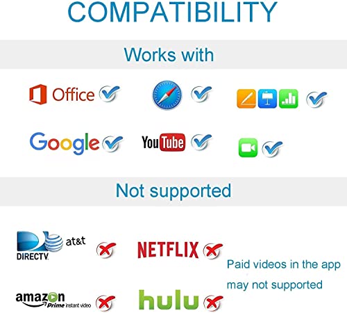 also supports streaming videos, pictures, games, slideshows on Facebook, YouTube, Twitter, Instagram, Reddit, Pinterest, Snapchat, IDMB, Microsoft Office etc. NOTE: Not support apps with "HDCP" copyright protection, not compatible with Netflix, Amazon Video, DIRECTV, HULU, Comcast TV, Xfinity, Vudu and other paid videos in Apps.