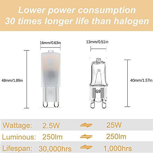 Lampadine LED G9 2,5W Luce Calda Caratterizzato da un minor consumo energetico: questa lampadina a led disegna solo 2,5 watt per lampadina ma equivalente a lampadine alogene da 25W. Ridurre il 90% delle bollette dell'elettricità e risparmiare notevolmente i tuoi soldi.