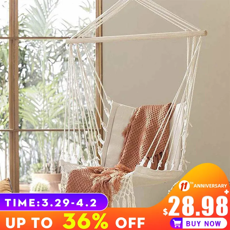 Nordic Style Home Garden Hanging Hammock Tassel Hammock Chair Outdoor Indoor Dormitory Swing Hanging Chair with Wooden Rod