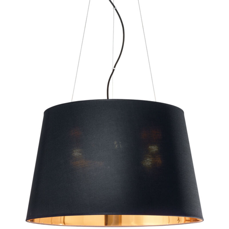 Montatura in metallo verniciato nero opaco. Paralume in lamina di PVC dorato rivestito in tessuto nero. Ø 50 x H min 53 / max 228 cm max 4 x 60W E27 IP:20