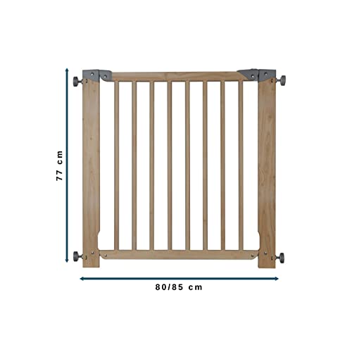 Per aperture da 80 a 85 cm, per fissare porte e scale, altezza di utilizzo = 77 cm, conforme alla norma NF EN 1930:02/2012, certificato 100% FSC, fissaggio a pressione a 4 punti, barriera rimovibile per liberare il passaggio, facile apertura con 1 sola mano, doppio blocco.