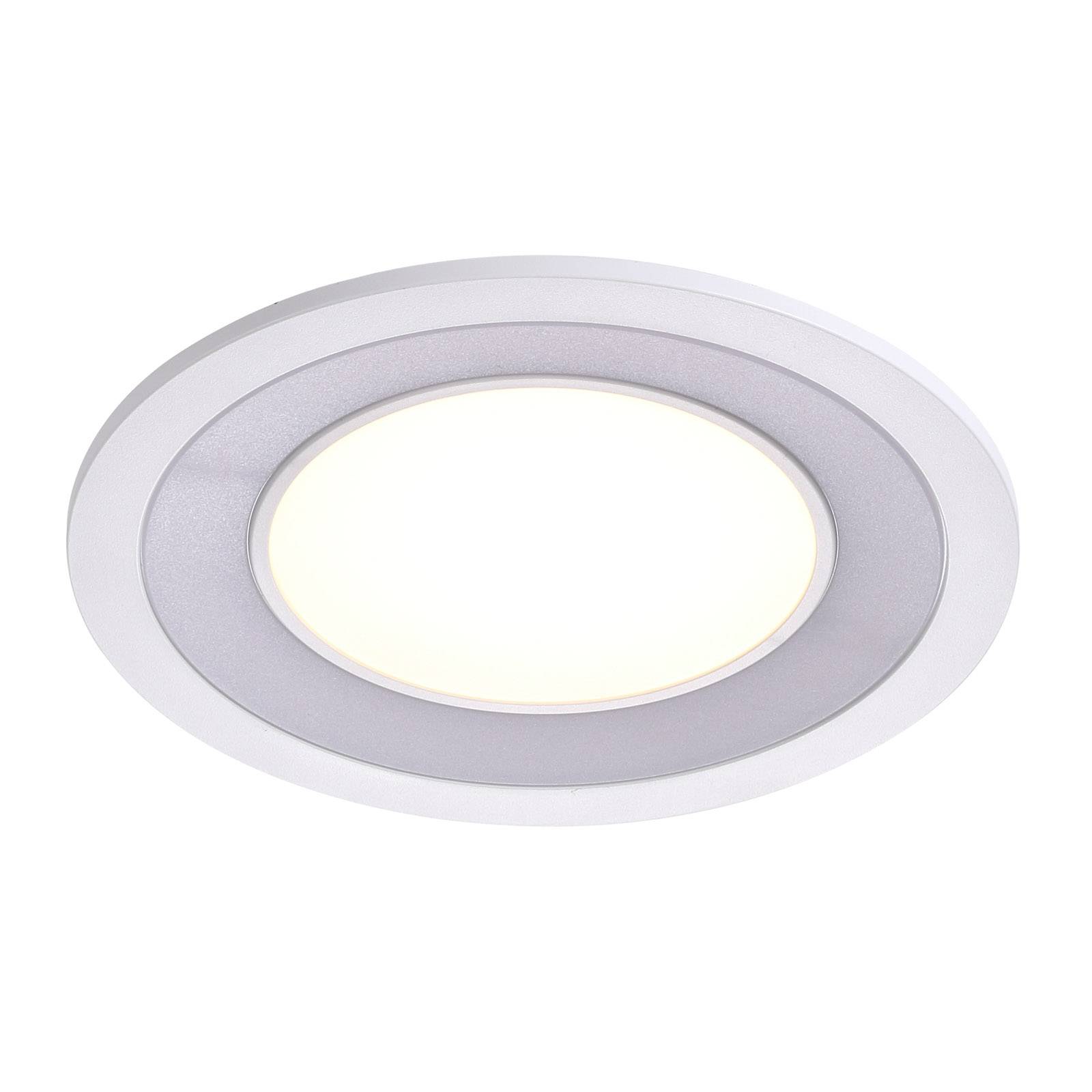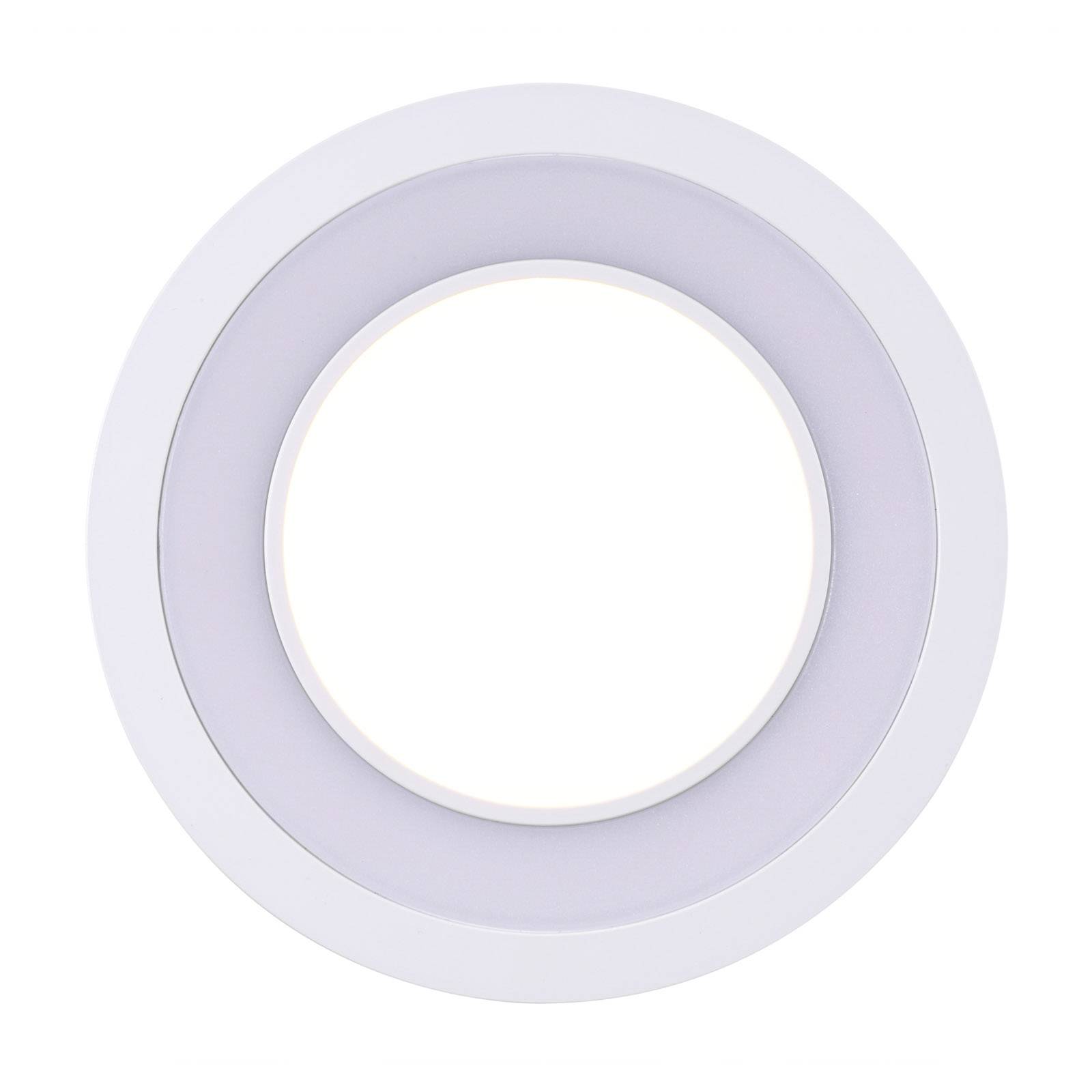 Downlight LED Clyde bianco da incasso in soffitto, con due superfici luminose Clyde è una lampada pensata per un'illuminazione regolabile dal soffitto in ambienti moderni. Emette luce bianca di tonalità calda. Le superfici luminose sono due, un cerchio interno e un anello esterno. Le due componenti sono separate da un sottile anello di plastica cui si aggiunge un bordo esterno più largo. La funzione MoodMaker™ consente di attivare insieme o separatamente i due circuiti servendosi del normale interruttore a parete.