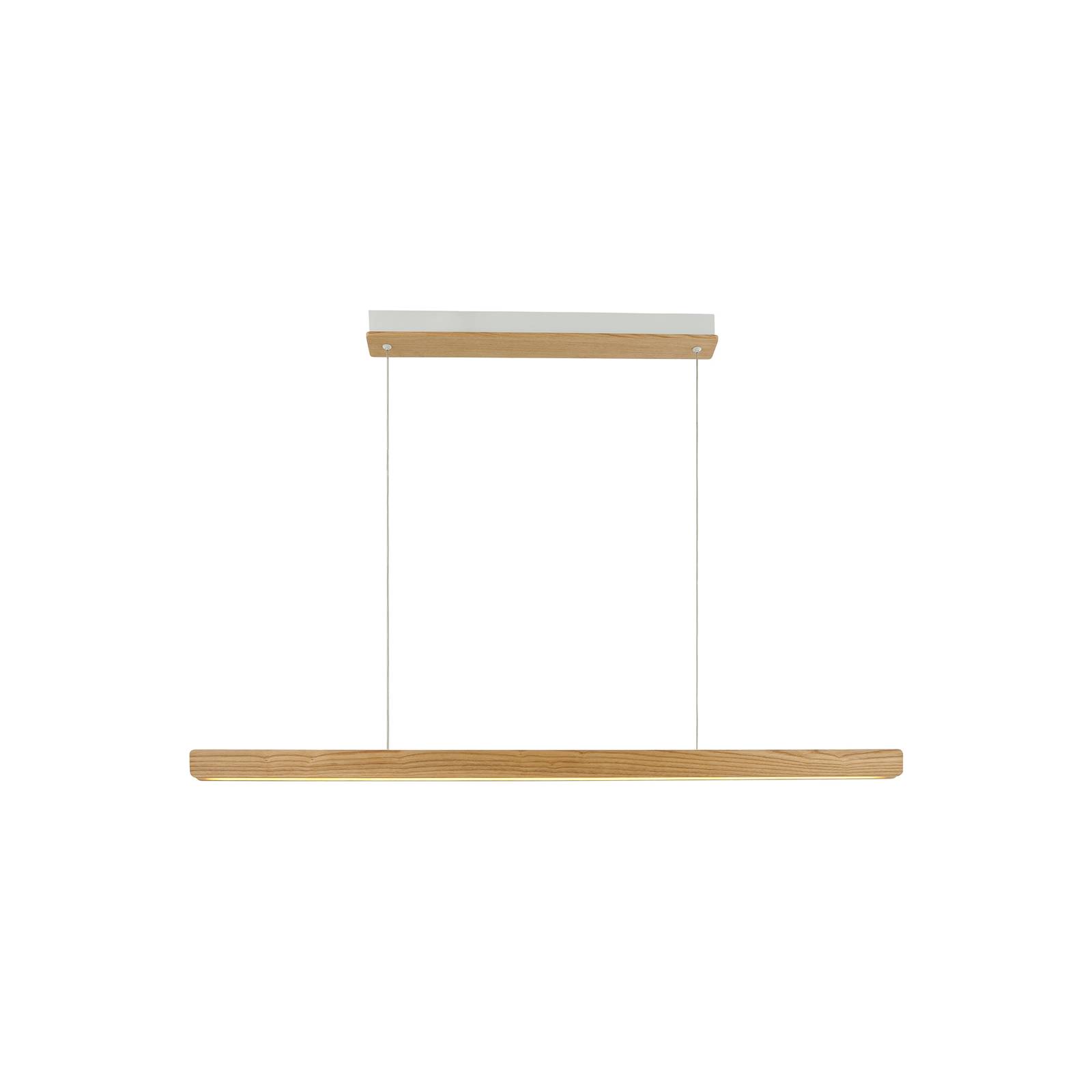Lampada a sospensione Ilgas a LED con lungo paralume in legno La lampada a sospensione Ilgas è caratterizzata da un design scandinavo sottile e da un'estetica elegante. Un elemento in legno chiaro è stato fissato al rosone bianco e il paralume, che contiene LED di colore bianco caldo, è anch'esso composto da due stretti elementi in legno che nascondono la striscia LED all'interno. Nella sala da pranzo sopra il tavolo o in cucina sopra un'isola, la lampada a sospensione Ilgas LED fatto LED con una luce calda e piacevole grazie ai LED dietro un coperchio satinato, che può anche essere dimmerato con un apposito dimmer a parete.