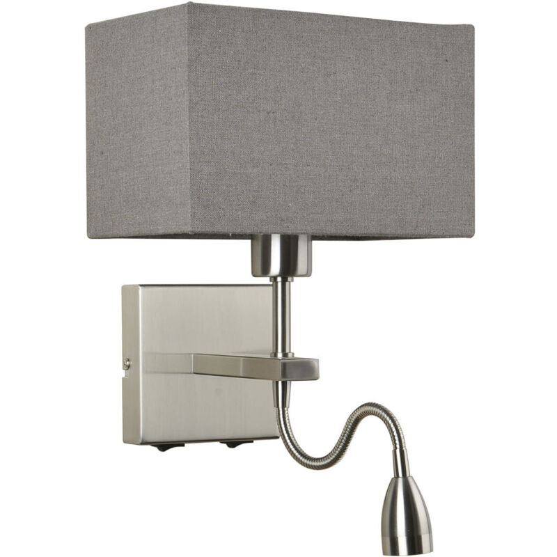 Italux Norte - Finitura: nichel | Finitura paralume: grigio, rettangolare | Materiale: acciaio, tessuto | Classificazione IP: IP20 | Altezza (cm): 29 | Larghezza (cm): 19 | Tipo di lampada: E27, LED integrato | Numero di lampade: 2 | Potenza: 60 W + 3 W | Kelvin (K): 3000K - Luce calda | Lumen (L): 350lm