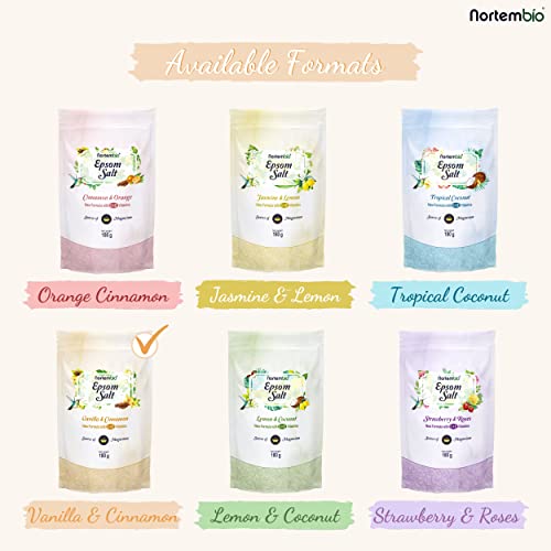 Nortembio Sali di Epsom 180 g. Sali da Bagno Profumati Vaniglia e Cannella. Solfato di Magnesio con Vitamina C ed E. Sale di Epsom per Rilassamento Muscolare e Dormire Bene. E-Book Incluso.