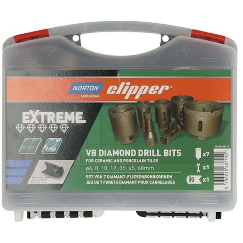 Piastrelle trapano corona set Pro cera VB asciutto Pro cera VB trapano a secco diamante Per l'essiccazione e foratura a umido di prodotti ceramici e densi, pietre naturali, marmi e lastre di granito e gres Alto tempo in piedi Pulire i fori e l'alta velocità di foratura per l'uso su smerigliatrici angolari contenuto: 6, 8, 10, 12, 35, 45, 68 mm, foraggio e ciotola di assemblaggio.