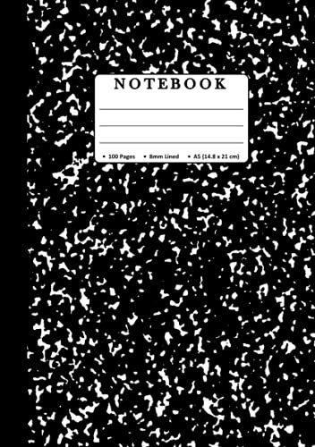 A5 Notebook: School Exercise Books, 8mm Lined Rule With Margin, 100 Pages, 29.7 x 21.0 cm, 90gsm Paper - Black Marble Cover