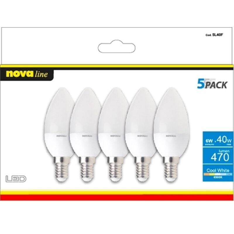 Set di 5 lampadine LED Oliva 5,5 W E14, marca NOVA LINE. Realizzate in alluminio rivestito e policarbonato, dimensioni 100x37 mm per uso interno. Ogni lampadina consuma 5,5 W con luminosità di 470 lumen e temperatura di colore di 4000 K (luce naturale). Classe energetica F, resa cromatica >80, diffusione a 270°. Durata di 20000 ore con 10000 accensioni. Non dimmerabili, equivalgono a lampadine incandescenti da 40 W, accensione istantanea.