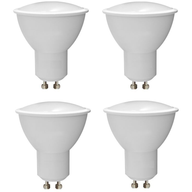 Set di 4 Lampadine Led Dicroica 6 W GU10, Luce Calda 3000K, Marca: NOVA LINE. Realizzate in alluminio rivestito e policarbonato, adatte per uso interno. Dimensioni: 58x50 mm. Caratteristiche elettriche: 220-240 V, 43 mA, 6 W, fattore di potenza >0,5, frequenza 50/60 Hz. Caratteristiche illuminotecniche: 490 lumen, classe energetica G, resa cromatica >80, angolo di diffusione 100°, 10.000 accensioni, durata 20.000 ore, non dimmerabile, innesco istantaneo.