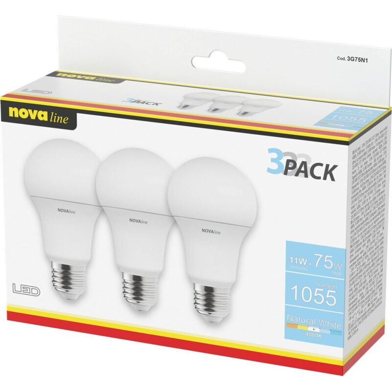 Il set di 3 lampadine Led Goccia 11W E27 Nova Line offre una luce naturale a 4000K per interni. Realizzate in plastica e alluminio, hanno dimensioni di 110x60 mm e operano a 220-240V con 61 mA e 11W di potenza. Ogni lampadina produce 1055 lumen con un angolo di diffusione di 180°. Hanno classe energetica F, resa cromatica >80 e una durata di 20000 ore con 10000 accensioni. Non sono dimmerabili, si accendono istantaneamente e equivalgono a lampadine da 75W in termini di luminosità.