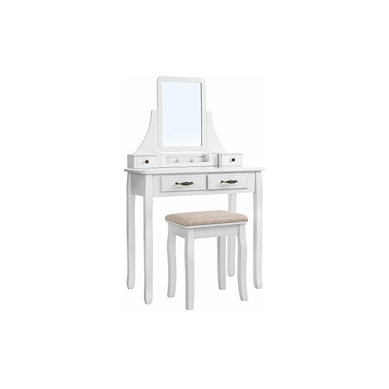Ordine totale, con 4 cassetti e un organizer per trucchi, con 6 scomparti, il tavolo da toeletta offre molto spazio e permette di riporre in modo ben visibile i vostri utensili da trucco, come pennelli, smalti, rossetti. Sistema a binario silenzioso: i 2 cassetti più grandi con inserto in tessuto bianco e blu sono dotati di guide scorrevoli e possono essere estratti facilmente, risultando molto pratici da usare. Specchio orientabile a 360°: il grande specchio può essere regolato in base alle necessità, per trovare l'angolazione perfetta durante il trucco. Non ci sarà più la necessità di piegarsi davanti allo specchio. Utilizzabile come cassettiera da trucco o scrivania. Come scrivania, l'organizer può essere rimosso o riempito con graffette, appunti e penne. Dimensioni del tavolo: 80 x 137,5 x 40 cm (larghezza x altezza x profondità). Materiali sicuri e stabili. Il nostro tavolo da toelettatura è realizzato in MDF e legno massiccio come caucciù e pino. L'imbottitura è in gommapiuma