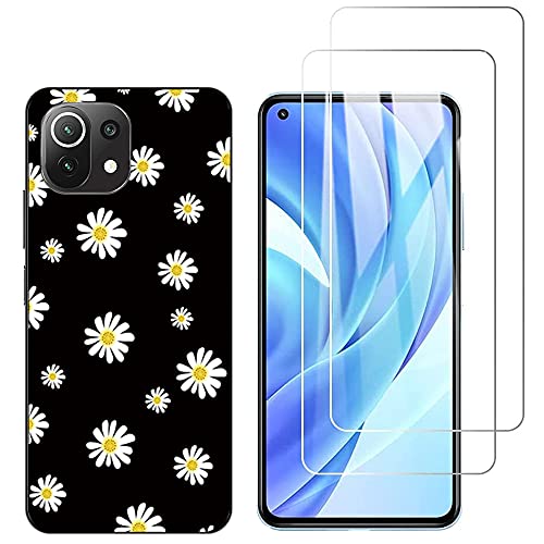 NOVAGO Compatibile con Xiaomi Mi 11 Lite 4G e 5G - Set Completo- Custodia Morbida Trasparente con motivi stampati + 2 Proteggi Schermo in Vetro temperato (piccoli fiori)