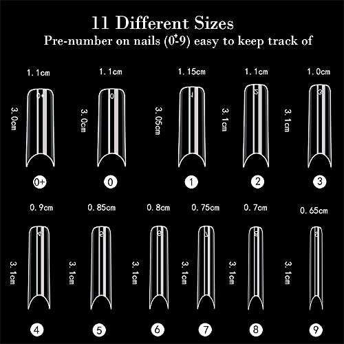 Noverlife - 1100 unghie finte a forma di C curva, forma quadrata, 11 misure, mezza copertura lunga, unghie finte in acrilico, punte artificiali per nail art salone e manicure fai da te - trasparenti